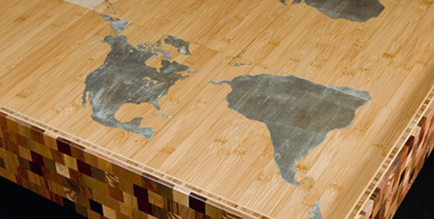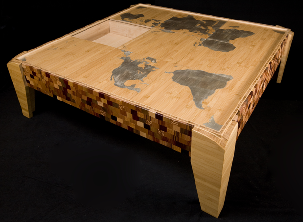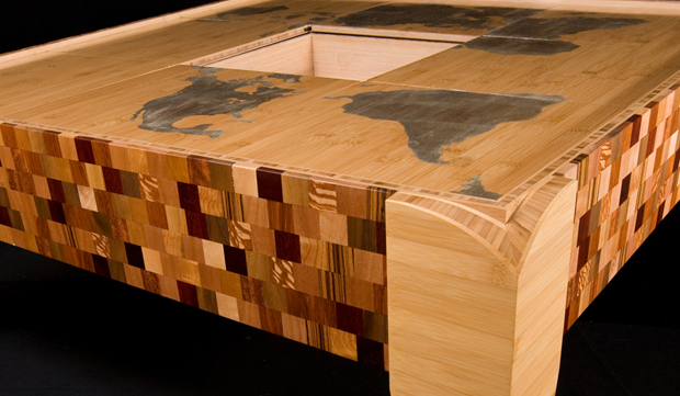 This table was made using bamboo and wood scraps from around the world. Each puzzle piece can slide horizontally or vertically much like an old fashioned finger puzzle. As the pieces are moved, storage compartments are revealed beneath. The map image (an accurate Pierce-Quincuntial square projection) is hand gilded in pure silver leaf showing a unique perspective of the world. Shown 36" square x 18" high, this design can be customized into dining tables, coffee tables, or game room tables.